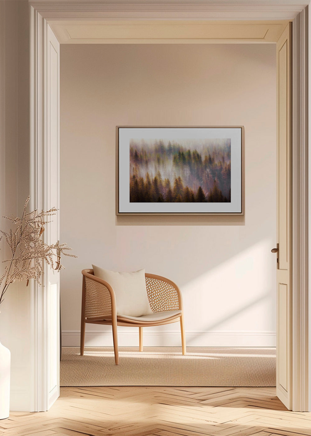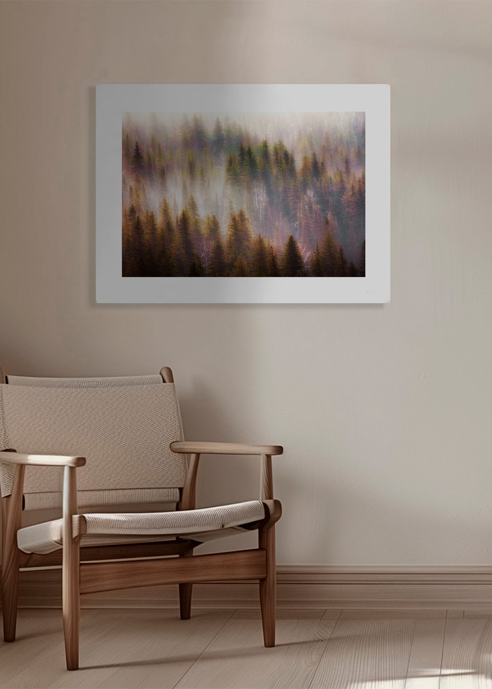 A print from our forest posters and wall art series, with green pigments, and in horizontal position. Nature is one of the best pieces of art around, don't you think? Combine our landscape prints for decoration that conveys freshness. This is the print your wall has been looking for. The white strip around the piece enhances its expressiveness.