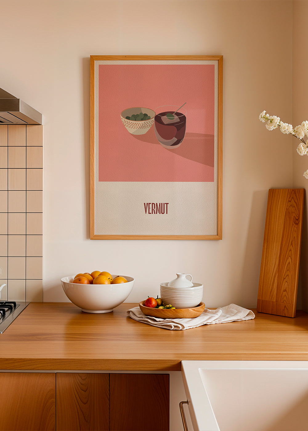 Beautiful poster from the cocktail posters collection, made by Nerea Ramírez, with touches of orange, and perfect to hang vertically. Prints for the kitchen are a perfect decorative element for such a cosy space. Walls full of creativity.